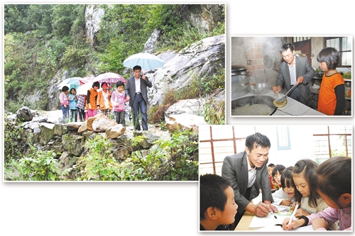 上图 放学了,张玉滚送学生们回家。右图 课下,张玉滚指导学生们写作业。(资料图片)下图 张玉滚为学生们做好了饭菜。