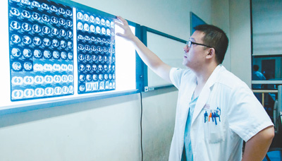 北京朝阳医院胸外科值班医生胡晓星在办公室读片,了解患者病情进展。本报记者 邱超奕摄