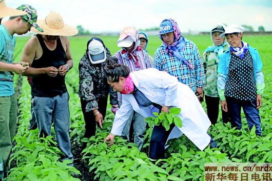李艳华为农民讲解大豆知识。本报记者杨喆摄