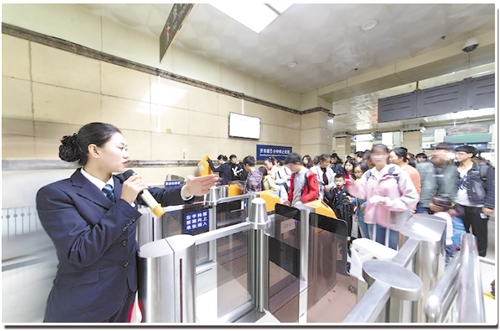 “旅客朋友们,由阿克苏开往重庆方向的K544次列车现在开始检票进站,有买好K544次列车车票的旅客,请携带好行李物品,排队检票进站……”在兰州火车站第三候车室,被旅客称为“喇叭妹”的张晶拿着话筒一遍一遍地广播着乘车信息。悦耳的声音、甜美的微笑,在熙熙攘攘的人流中如秋日暖阳,陪伴着旅客踏上旅程。 9月30日是兰州车站国庆假期的客流最高峰,当天发送旅客12.1万人,创造了建站66年以来的单日最高发送纪录。因为客流比往日要大得多,张晶早上6时30分就赶到了车站,比平时提前了一个半小时。 “我的工作就是用‘小喇叭’发出乘车提示,引导旅客有秩序地检票进站,带残障人士、老人等重点旅客走‘绿色通道’,组织他们优先检票进站。”正在候车室寻找重点服务对象的张晶用寥寥数语介绍自己的主要工作。 乘车广播,巡视大厅,引导进站,检票放行,张晶一个班下来要用“小喇叭”重复播报乘车信息上千次,平时“话痨”的她口干舌燥,回到家再也不想多说一句话。张晶负责3号候车室,完成广播和引导工作后,还要“马不停蹄”地赶往检票口担负检票任务。“最忙的时候同时来3趟车,一个人要服务1000多人,连个喝水的时间都没有。”张晶笑着说。 “您好,兰州开往银川的K9882次列车已经开始检票,请带好您的行李抓紧时间上车。”说话间隙,张晶逐一轻声叫醒几名睡着的旅客。当旅客丢失车票、钱包、行李或有儿童走失时,都会第一时间找她求助。“我很享受帮助别人,旅客的一声‘谢谢’让我感到很温暖。” 坎坷旅途,温暖相随。张晶不知疲倦地穿梭在熙熙攘攘的人流中,一天竟要“快走”2万多步,用这个距离反反复复丈量着铁路服务旅客的真情厚意。(本报记者 李琛奇 通讯员 贾国庆 宋佳龙)
