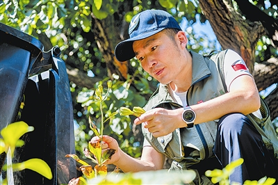 在林间为山林鸟类搭建仿真鸟巢。