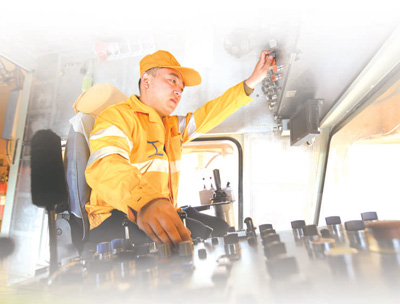 日前,济青高铁枢纽工程济南东站附近工地,济南工务机械段31岁的李钢,正在操纵着大型道岔捣固车完成线路维修作业(图①、图②,王玉建摄)。线路捣固作业是为了使铺设在钢轨和枕木下的石渣均匀密实分布,保障列车平稳运行。