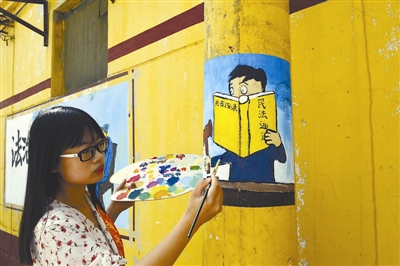 2017年5月7日,山东聊城大学生志愿者闫丽娟在电线杆上绘画民法总则的漫画。