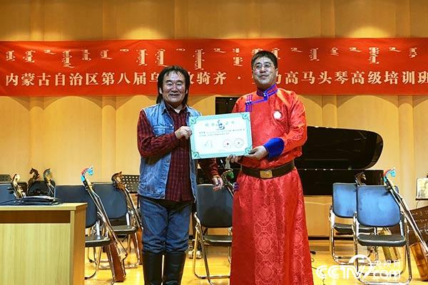 马头琴大师齐·宝力高为陈洪雷颁发证书(受访者供图)