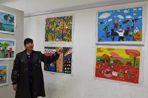 五天后,好消息传来,古丽扎尔应聘成功,被县文化馆录取了。进入文化馆工作后,古丽扎尔学习更加勤奋了,在专业老师的指导下,画画水平稳步提升。2018年10月份,古丽扎尔画的《巴扎天》农民画以600元的价格卖给浙江客商。
