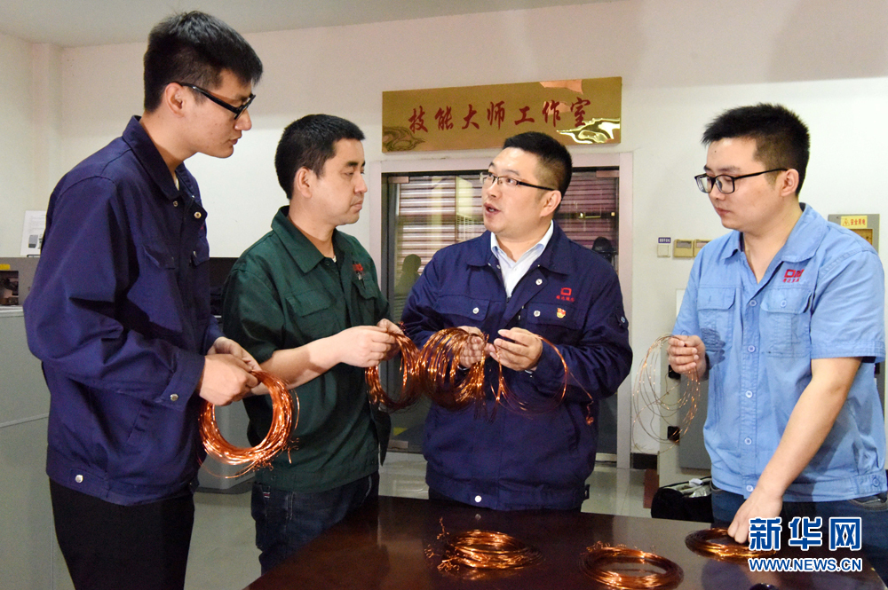 4月26日,在安徽铜陵精达特种电磁线股份有限公司“苏保信技能大师工作室”,苏保信(右二)进行特种电磁线技术攻关。