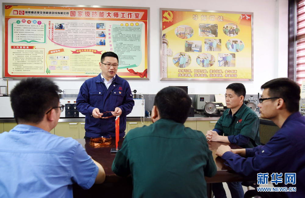 4月26日,在安徽铜陵精达特种电磁线股份有限公司“苏保信技能大师工作室”,苏保信(左二)带领团队进行特种电磁线技术攻关。