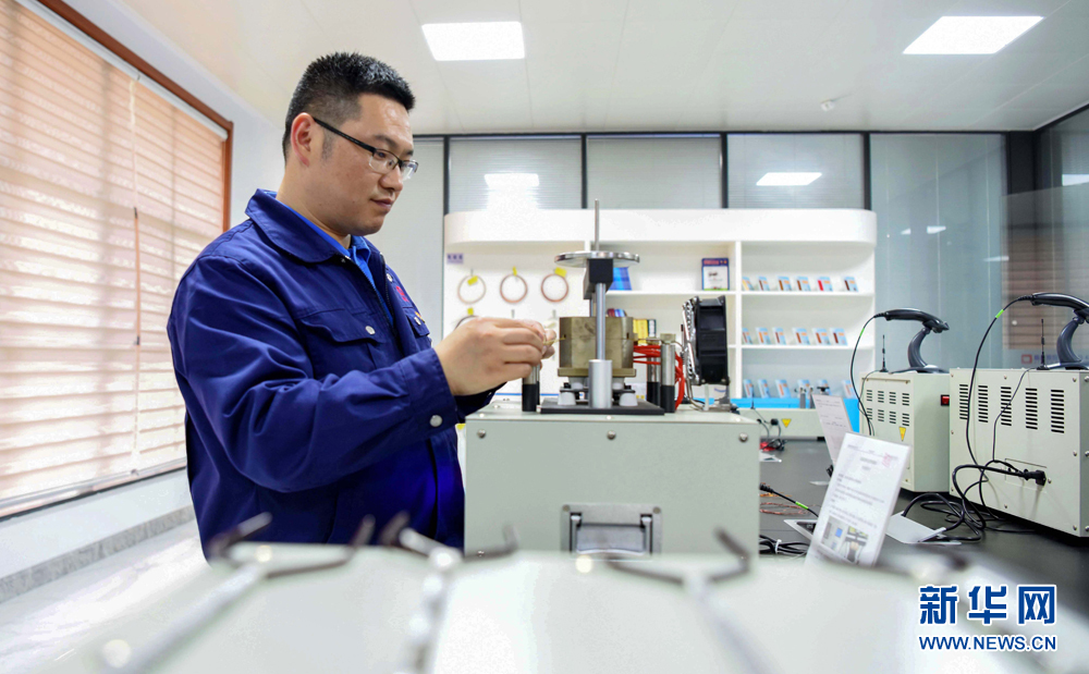 4月25日,在安徽铜陵精达特种电磁线股份有限公司技术中心实验室,苏保信进行特种电磁线技术攻关。