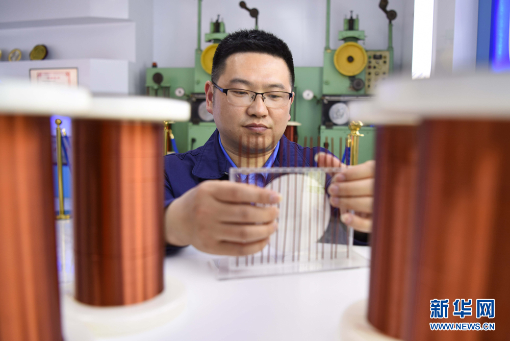4月25日,在安徽铜陵精达特种电磁线股份有限公司技术中心实验室,苏保信进行特种电磁线技术攻关。
