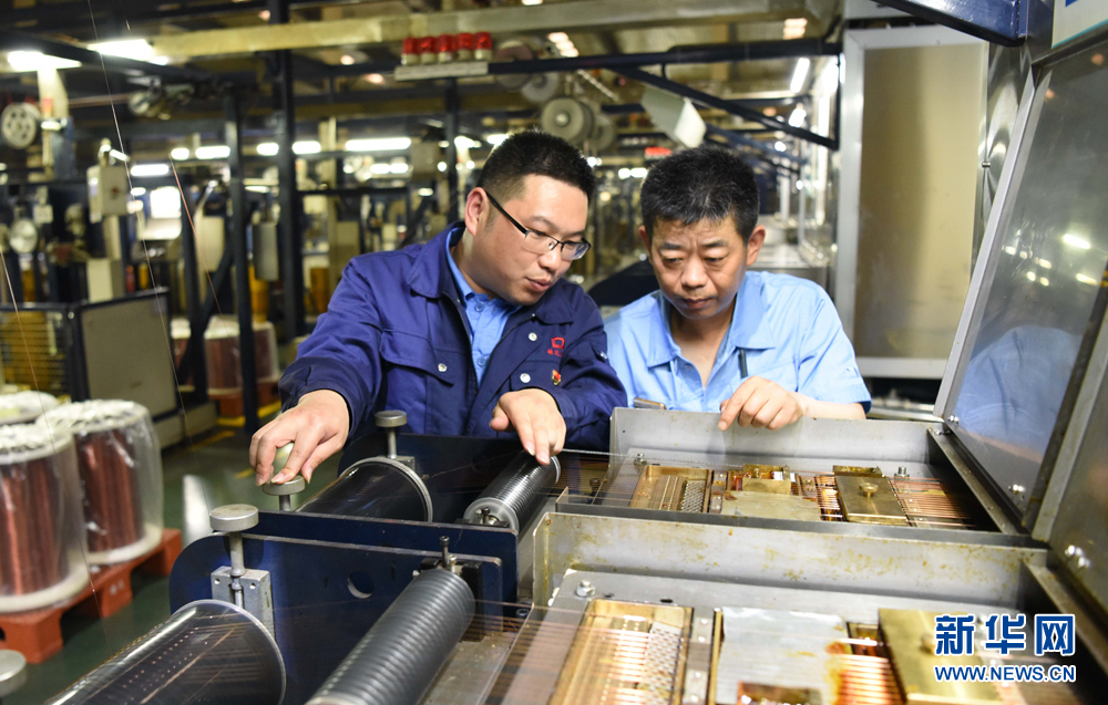 4月25日,在安徽铜陵精达特种电磁线股份有限公司生产车间,苏保信(左)进行特种电磁线技术攻关。
