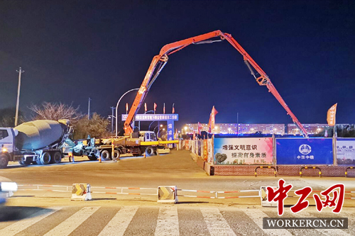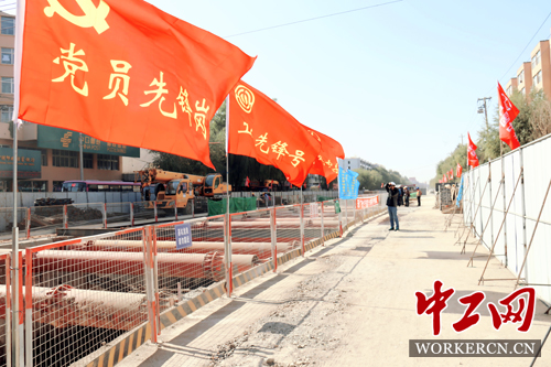 施工现场三面旗帜迎风招展。(高阳 摄)
