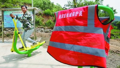 王东柱负责巡查村附近的一段长城,长2912米,包括一座烽火台和两个敌楼。只要不遇极端恶劣天气,他每天都要巡查一次,一次三四个小时。近几天,北京高温预警频发,他的工作照常不误。出发前,他会认真整理背包,包里装着防刺手套、医疗急救包、护膝、头灯,还有指南针、救援绳、哨子、锯子等工具。为防止蚊虫叮咬、树枝荆棘划伤,即使是炎热夏季他也是长衣长裤,外加一件印有“长城保护员”的反光背心。