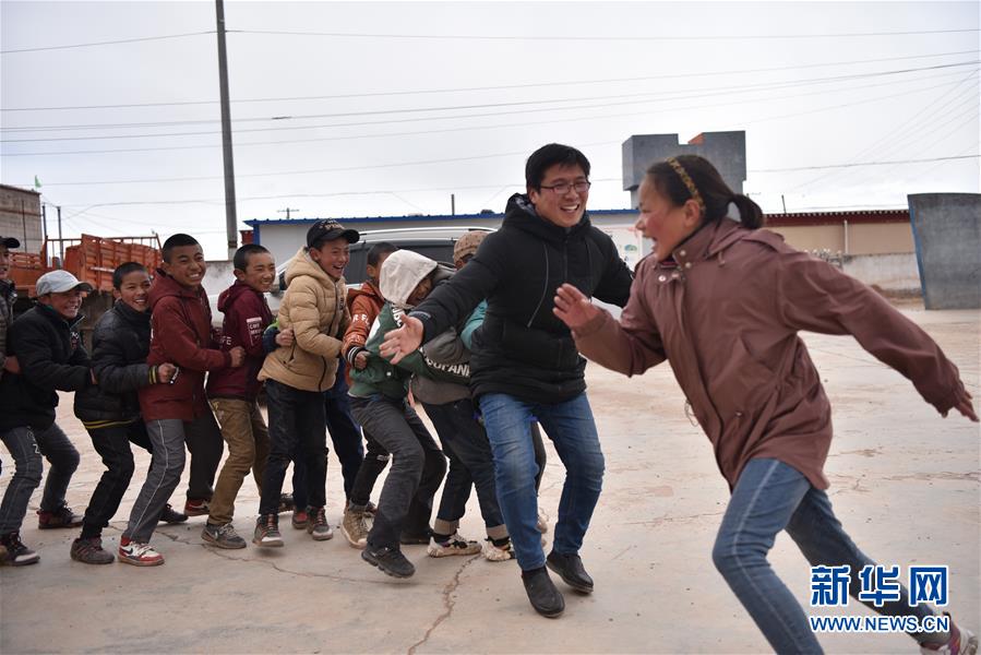 杜安东和学生们在课间做游戏(5月22日摄)。 新华社记者 周锦帅 摄