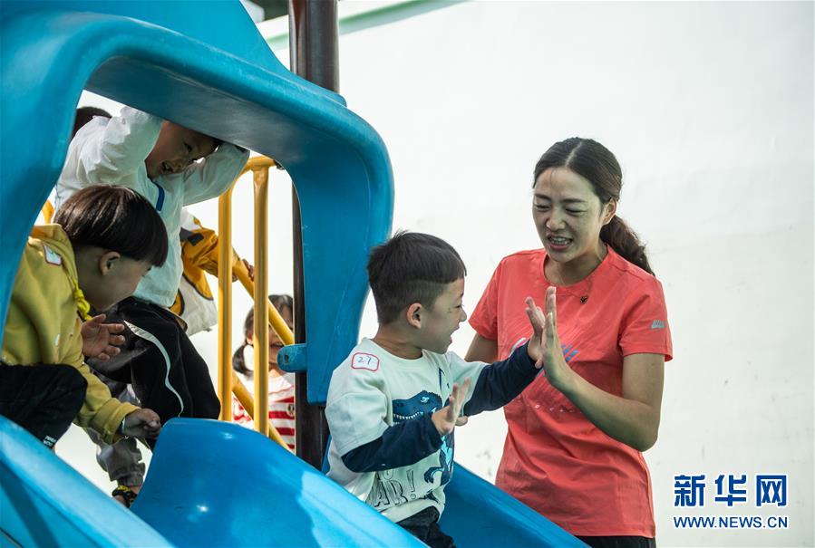 9月9日,何梅在幼儿园与小朋友们一起玩游戏。 新华社记者 陶亮 摄