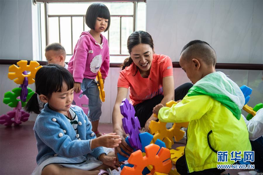 9月9日,何梅在幼儿园和小朋友们一起玩玩具。 新华社记者 陶亮 摄