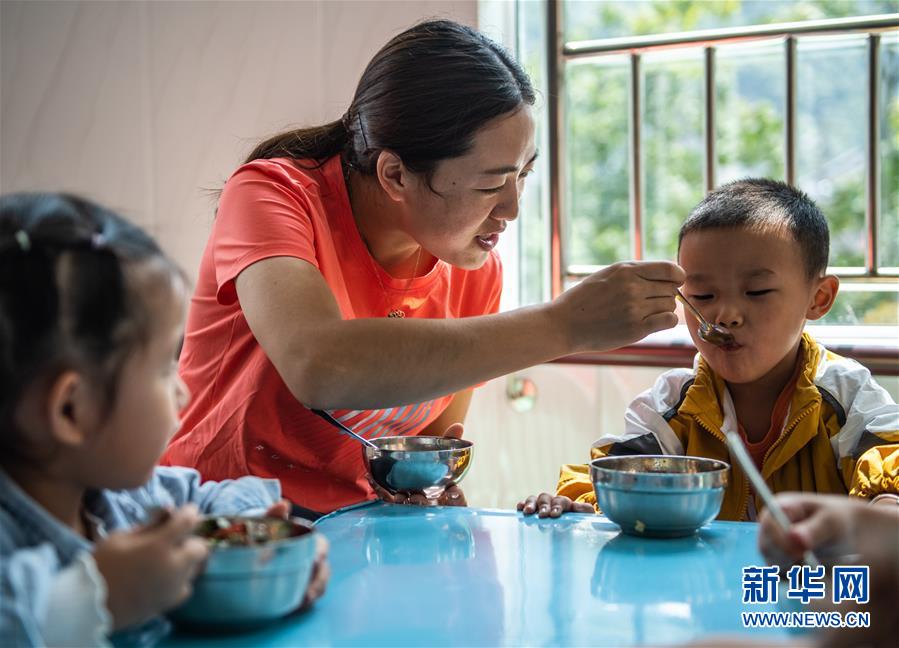 9月9日,何梅在幼儿园喂一名小朋友吃午饭。 新华社记者 陶亮 摄