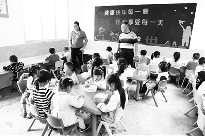 9月9日,贵州省榕江县忠诚镇苗本小学的夫妻教师滚录权、潘明珍在照看学生吃午餐。