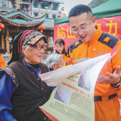 国网四川电力送变电党员服务队队长李兴宇(右)向藏族群众宣传防山火安全知识。叶海平摄