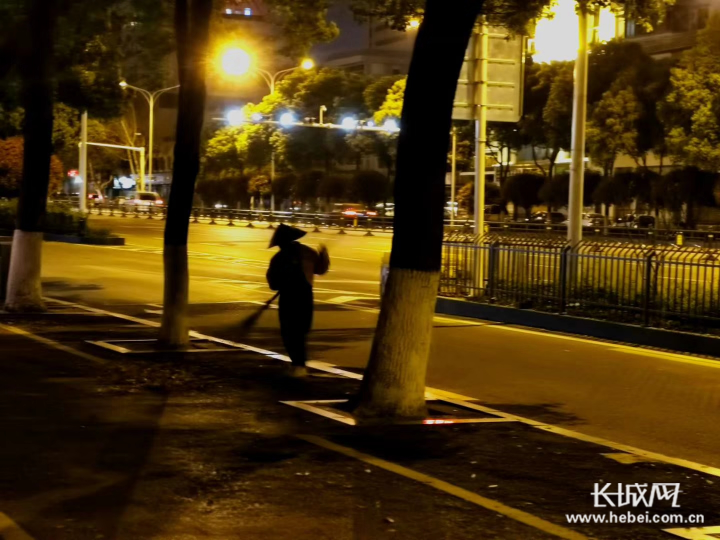 夜深人静,武汉一名清洁工在清扫路面。