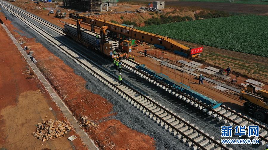 10月5日,在中铁二局等单位承建的水曹铁路施工现场,铁路建设者在河北唐山滦州茨榆坨镇进行铺轨作业(无人机照片)。水曹铁路位于唐山市境内,本线北端接轨卑水线可达首钢水厂矿区,南端直达曹妃甸港区矿石码头和通用码头。 国庆、中秋“双节”期间,全国各地依然有建设者在工地一线施工,确保各建设工程稳步推进。 新华社记者 牟宇 摄