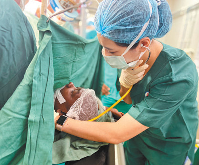 中国第二十二批援莫桑比克医疗队队员为手术中的病患监测体征。中国援非医疗队供图