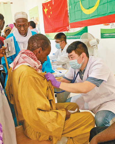 中国第三十三批援毛里塔尼亚医疗队队员为当地民众义诊。中国援非医疗队供图