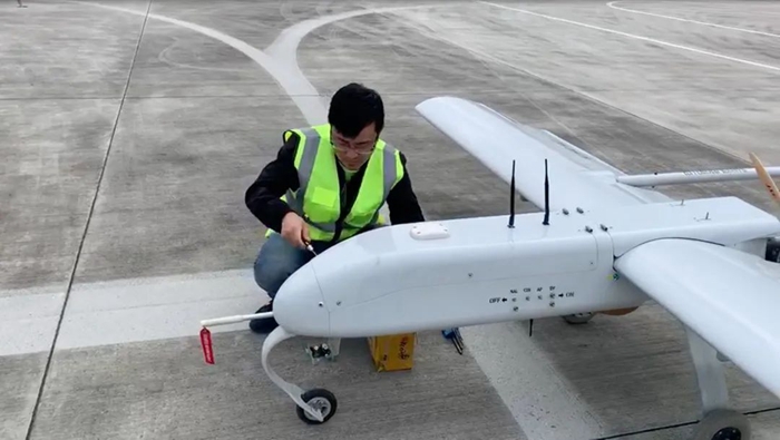 上图为彭世涛在检查维修一架用于测绘、航拍的民用无人机。