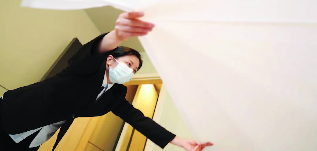 首先,她将床单叠成方形,仔细翻开4个边角,用左手的拇指、食指和中指捏住其中两个角,“这个动作是为了保持床单的平整性。”她向记者解释道。随后,只见孙利军右手抓住床单一侧,在空中一抖、一甩、一抛,划出一道漂亮的弧线。随后,双手各捏住一个床角,向两侧一撇,床单如降落伞一般,平稳而缓慢地落在床垫上,服服帖帖,整个过程只用了不到10秒钟。