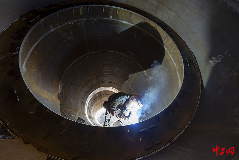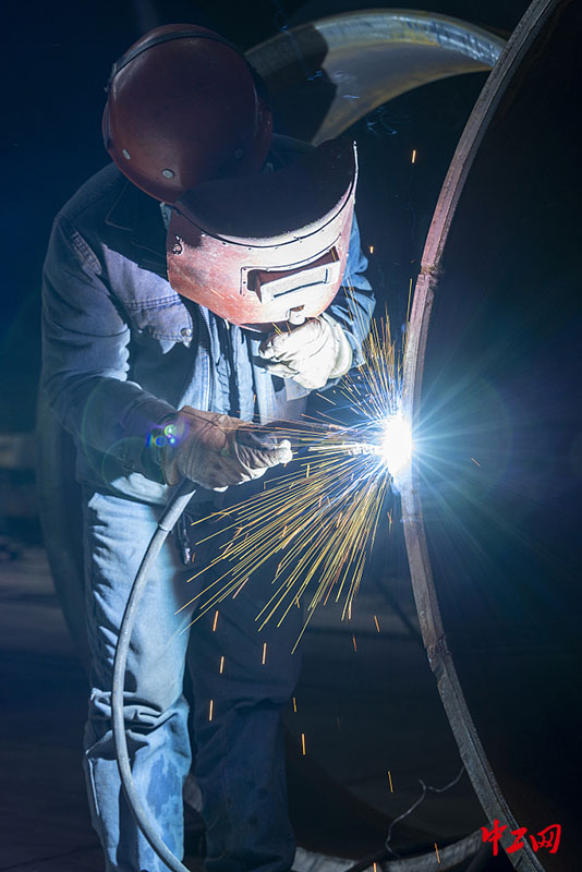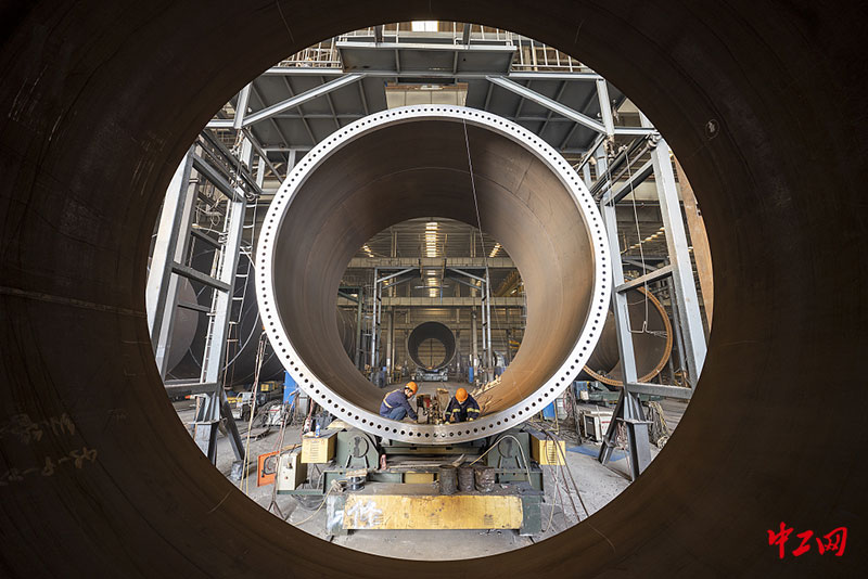 2020年11月29日,在江苏省盐城市射阳县新能源产业园江苏长风海洋装备制造有限公司车间,工人正在焊接海上风电钢管桩。(张凯峰/视觉中国)