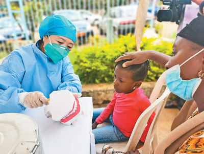 中国第二十批援喀麦隆医疗队队员为当地民众介绍口腔卫生知识。中国援非医疗队供图中国第二十二批援莫桑比克医疗队队员为手术中的病患监测体征。中国援非医疗队供图中国第三十三批援毛里塔尼亚医疗队队员为当地民众义诊。