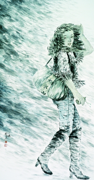 以《都市闲情》命名的系列作品令人耳目一新之处,是一种新的视觉,一种新的笔墨语言秩序,一种充满内在节奏的情绪表达。平面空间中的二维人物、环境,在画家笔下都相当简洁,画面中的人与物都是空间中的符号,在无中心与无边缘中,都处于同一平面中,而笔墨、形式与意象、符号表现了直觉视界中的固有形式。虽然,抛弃了透视,消解比例,没有体量,隐去了光影,却营造了一种新的平衡,画面上产生了自然、宁静、耐人寻味的情绪范围。在这里,展开了“当下”青年女性的“心路历程”是十分贴切的。