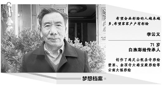 虽然对于传承基地的建设让李云义不无遗憾,但儿子李艳峰对彩绘的执着让他稍感欣慰。李艳峰计划着创建一个古建筑彩绘公司,把双廊镇做彩绘的艺人集中起来,以公司的名义承接工程,让白族彩绘在经济上也体现出自身的价值。老人希望会画彩绘的人越来越多,希望家家户户有彩绘。(杨文明)