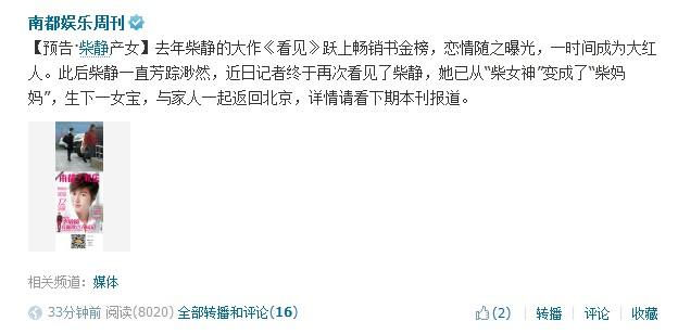据《南都娱乐周刊》微博消息,柴静自《看见》一书大火后一直芳踪渺然,近日南都记者终于再次看见了柴静,她已从“柴女神”变成了“柴妈妈”,生下一女宝,与家人一起返回北京。而在南都最新曝光的封面上还写有“柴静美国产女,抱女回国全家亮相”的字样。