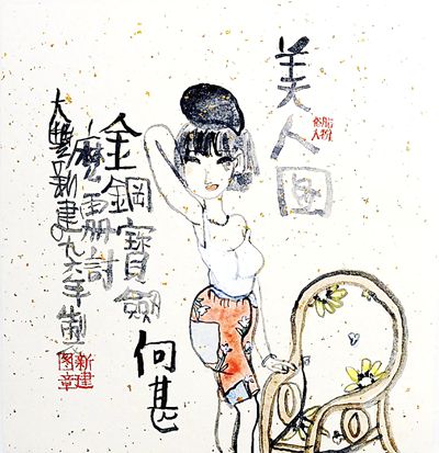 谈朱新建,不可能绕过他的美人图。他笔下的美人完全不同于传统中国画中的端庄仕女,而是一个个搔首弄姿地展现着妩媚、娇憨的“女人味儿”,还往往衣不蔽体,风情外露。