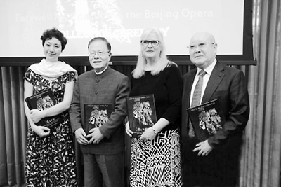 尚长荣(右一)等与收藏《霸王别姬》的洛杉矶加州大学图书馆馆长斯蒂尔(右二)合影。夏嘉摄