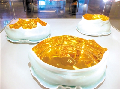 而走进位于大厅一侧的安田猛作品展览时,记者不禁放慢了脚步,安田猛这次专门为成都制作的陶瓷作品都是青白釉系列的,作品小巧而精致,很具有东方韵味。安田猛此次展览中最重要的作品就是金碗,他的金色铺满青白瓷,给人很抢眼的感觉,鲜明的颜色对比似乎正是安田猛东西方结合的最好证明。青白瓷金碗上起伏有序却又具有柔软视觉效果的边线与口沿,温婉的青白釉色与张扬的金色所产生的强烈对比,展现出水滴落入湖面时激起水花的一霎那的风景。他的作品尺寸都较小,与弗里斯蒂的大件瓷器不同,安田猛的作品是沉着内敛的,形态虽小却很实用。