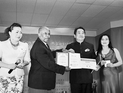 本报电 (博红)应博茨瓦纳中国和平统一促进会暨华人慈善基金会的邀请,中国著名相声表演艺术家、中国曲艺家协会主席、中国和平统一促进会常务理事姜昆近日率团访问博茨瓦纳并进行慰侨演出,与旅博侨胞近距离接触,亲切交流,共同探讨中国文化对外传播,深受侨胞欢迎。访问期间,姜昆被聘任为博茨瓦纳中国和平统一促进会暨华人慈善基金会、非洲中国慈善与文化交流协会荣誉主席,同时任博茨瓦纳中国友好协会荣誉顾问。博茨瓦纳前总统费斯图·莫哈伊亲自为姜昆签署证书并颁发(见图)。