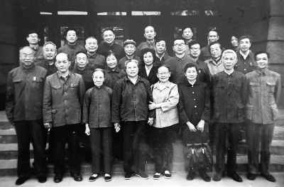 “第二次全国少儿文艺创作评奖”评委们在团中央门前合影,康克清(前排左四)、胡启立(二排右四)、严文井(前排左二)、冰心(前排左三)、金近(二排左二)、洪汛涛(二排右一)。