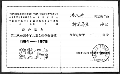 洪汛涛的后期童话写于“文革”后,有《夹竹桃》《破缸记》《鸟语花香》等,以荣获中国作家协会首届全国优秀儿童文学奖的《狼毫笔的来历》(1982年)为代表,重在反思人性,剖析复杂多面的人生世相与社会文化的深层次根因,热情歌颂忠厚、善良、正直、献身的人格魅力。如果说《神笔马良》更多的是浪漫主义的话,那么《狼毫笔的来历》则更侧重于现实主义,它要求用笔去揭露虚伪世界,去刻画真实世界。