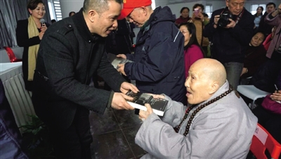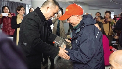 作家何顿向抗战老兵王聿(左)、吴淞(右)赠送亲笔签名的小说