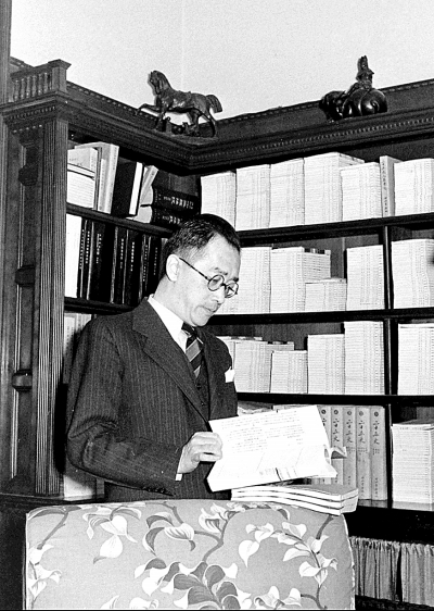 1941年,胡适在驻美大使官邸中翻阅古籍。 资料图片