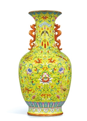 清乾隆黄地洋彩锦上添花暗八仙双龙耳瓶。小小 供图