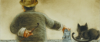 2004年,熊亮完成了绘本《小石狮》。他想表达的是家乡人去广州、去香港、去北京,思想越来越西化,而对故土、对传统文化越来越疏离。他想借小狮子来传递一种文化的回归,“这些东西你很难给小孩子讲明白,但是通过画面我能表达出来。”在《小石狮》里,小狮子抿着一张弯弯的大嘴,目光炯炯地望着你说,“我是小镇的守护神。我是小镇里唯一的石狮子,唯一的守护神。别看我的个子比猫还小,可这里再老的老人也比我小得多……”在画面的表现上,第一页,小石狮比房子还大,第二页它占据了半页,第三页占了整个画面,它越来越大,但后来又出现转折……