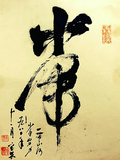 侯宝林“沙书”书法:“一带(代)山河,少年努力”。(作者提供)
