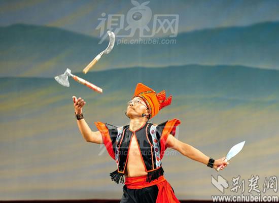 湖北省来凤县土家族农民向前和经过40多年的悉心钻研和自我挑战,利用砍刀、尖刀、菜刀、斧头等四种不同的利器,将“三棒鼓”的刀技表演与土家人民生产、生活中的动作相结合,创造了一项独特的飞刀绝技,其动作优美、惊险、刺激,让观众惊呼叫绝的同时,也给自己带来了可观的收益。