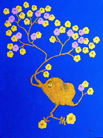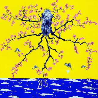 2015年春天,董重穿着黑色的夹克衫趴在工作室的画板上细描,一根一根,直到画面中的躯干长满细毛,贴得近了能窥见细毛间的人脸,像生灵一样依附着。董重画的这个躯干,灵感来自上次在南极看到的大鸟,黑漆漆的,张开翅膀从眼前飞过,有点吓人。但野性到雅致,在董重手里也许只有一步之遥。他将背景用丙烯颜料反复涂抹成平整的蓝色,让毛茸茸的躯干生长出梅花,画面便绮丽风雅起来。