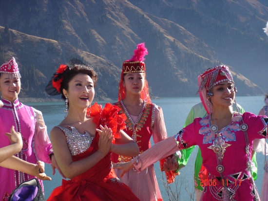 刘媛媛和其他演员一起在新疆拍摄歌曲《我们是兄弟姐妹》MV。资料图片