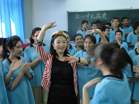 刘媛媛和乌鲁木齐第六十六中学的学生在一起。资料图片