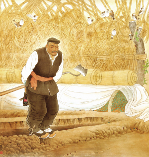 选择全身心地投入到中国画吸纳丰富的民间绘画营养的创作中,取长补短,坚持走着一条特殊的艺术研究道路。特别是从天津杨柳青年画认知民间艺术,发现原来一张年画中融入了那么多老艺人的智慧与心血。口传心授的口诀,虽不见于画典,但已是他们心中的书,比如“软靠硬色不愣”“红配黄喜煞娘”“蓝配紫不如死”等都是在长期艺术实践中得来的宝贵经验。在杨柳青老艺人的帮助下,先生创作了《迎着朝阳》、《幸福歌》、《下乡》等多件作品。1984年,《幸福歌》作为第六届全国美术作品展览优秀作品,被中国美术馆收藏。而且在长期的北辰民间绘画辅导研究工作中,总结出北辰民间绘画的艺术风格,概括为:题材广泛,以心造象,求全求满,洗练夸张,妙用装饰,情深意长,诙谐风趣,色彩响亮,植根津郊,美洒四方。这些特点使先生茅塞顿开,不受三维成像写实手法的局限,予以大胆的夸张变形和时空切换,强化色彩对比,突出装饰美感和现代构成,经过不断探索,终于陆续创作出《浓彩》、《绘心曲》、《巧妇》等艺术作品。其中《巧妇》描绘的是一位农妇正在做饭的情节。灶下烧着干柴,锅内四周贴着黄澄澄的玉米面饼子,农妇正在安排锅中的炖鱼,这是津门颇受欢迎的“贴饽饽熬鱼”。画中的形象动作是夸张的,色彩是装饰性的。农妇穿的是大花红袄,系着白花蓝围裙,脚下穿双绣花红鞋,发髻上还嵌着一朵绿叶大红花,看上去极其美丽干练。左手正拎着黄色大锅盖,右手拿着一双红筷子在摆弄锅中的鱼。这三条鱼共一个头,曰《三鱼争头》,显然借鉴了民间绘画中常用的透叠手法。白色灶台放着白花蓝色罐子和黄把黑色铁铲。灶旁一只白色黑花蓝眼睛仰头叫着的小猫,连墙上的辣椒、地上的板凳也是变化了的形体和夸张的色彩,画幅内容生动、色彩斑斓,营造出一种绚丽而亲切的氛围。充分表现了原始、质朴、纯真、轻松的感觉。如果说“选择”群众文化工作,进而零距离接触到民间绘画是一种“机遇”,那么先生抓住了这一机遇,并在民间艺术宝库中不断获取营养充实自已,就是先生绘画艺术的创造,是其另一种对绘画追求的“选择”。