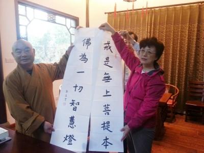 昨天,刚刚在杭州参加完“弘一大师诞辰135周年学术研讨会”的台湾弘一大师纪念学会僧众又来到扬州朝山拜佛,弘一法师的嫡孙女李汶娟、李莉娟姐妹也一起来到扬州。李莉娟特向大明寺方丈能修法师赠送了自己的弘体书法,对联上写道:“佛为一切智慧灯,戒是无上菩提树”。能修法师双手合十,十分感谢。因为他也习过弘体,对弘一法师和弘体都有着很深的感情。